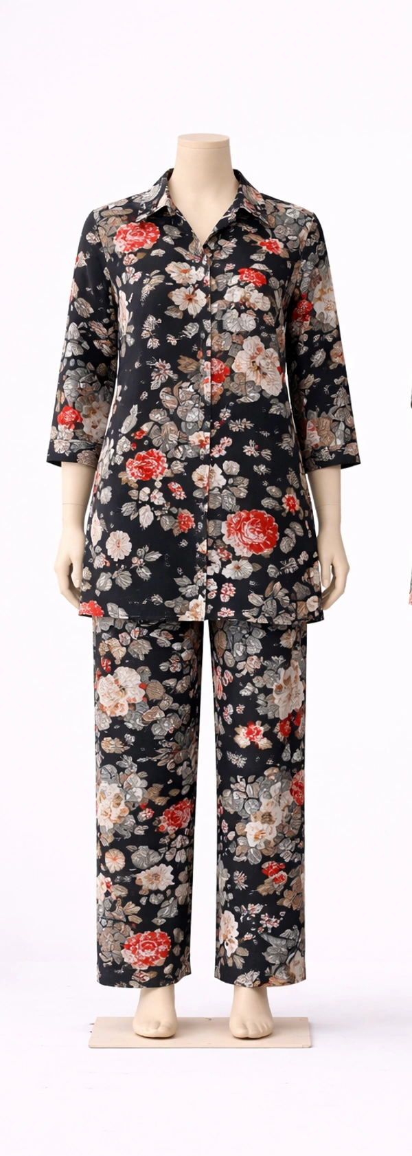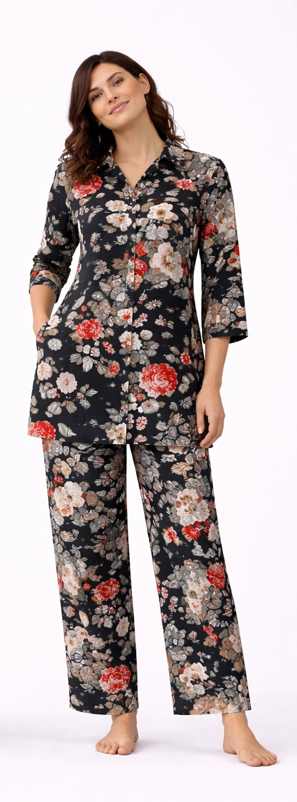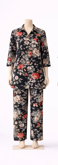 Elegant Black Floral Printed Night Suit Set with Mid-Length Shirt for Wome