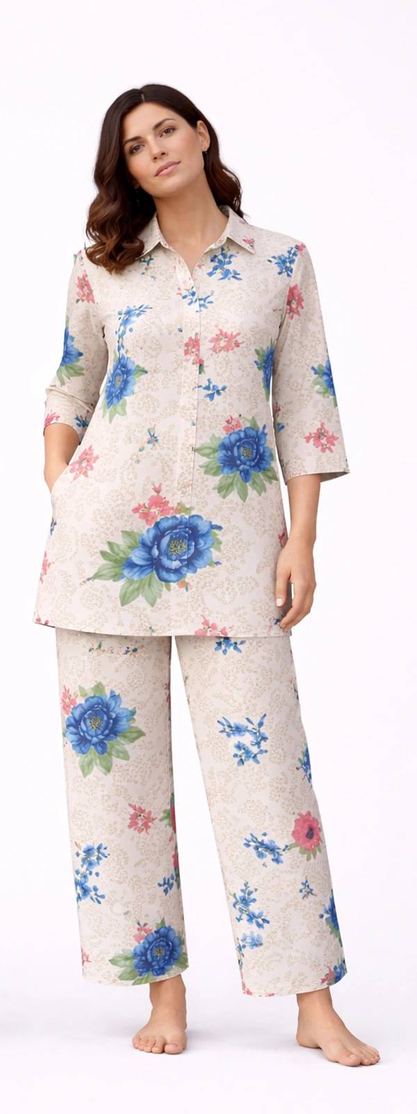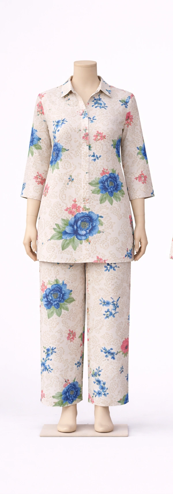 Floral Printed Long Shirt Night Suit Set for Women