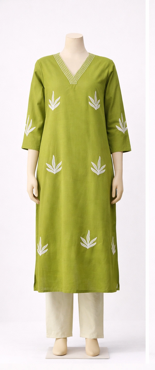 Light Olive Green Kurti with elegant white leaf embroidery 🌿